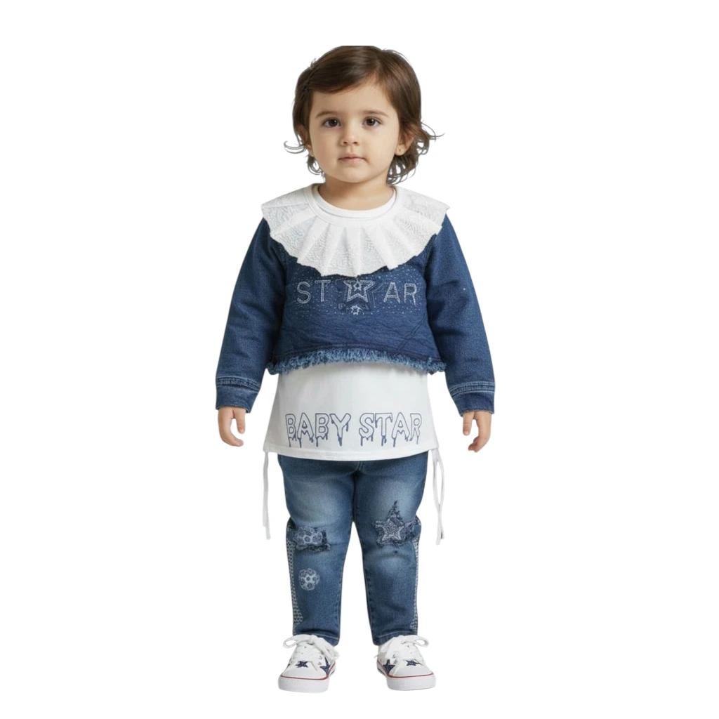 Style: Layered Denim Top with White Inner Shirt and Matching Jeans